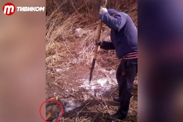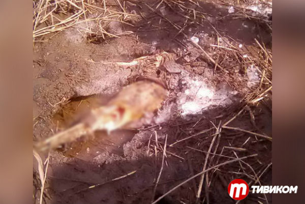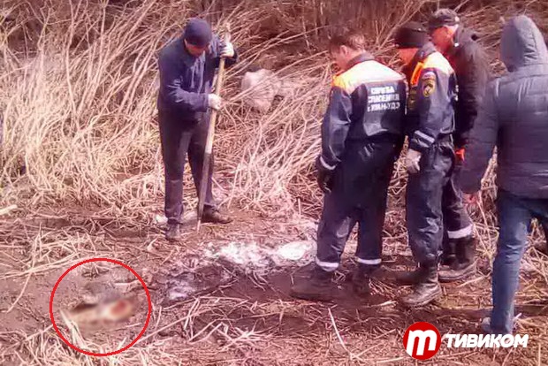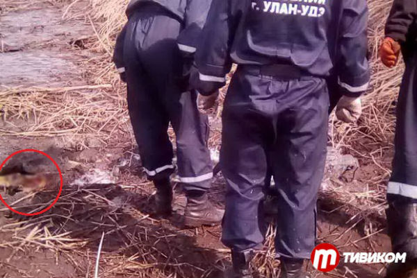Как видно на фото, тело вмёрзло в лёд, и уже долгое время пробыло в земле — около полугода. По предварительным данным, это женщина.