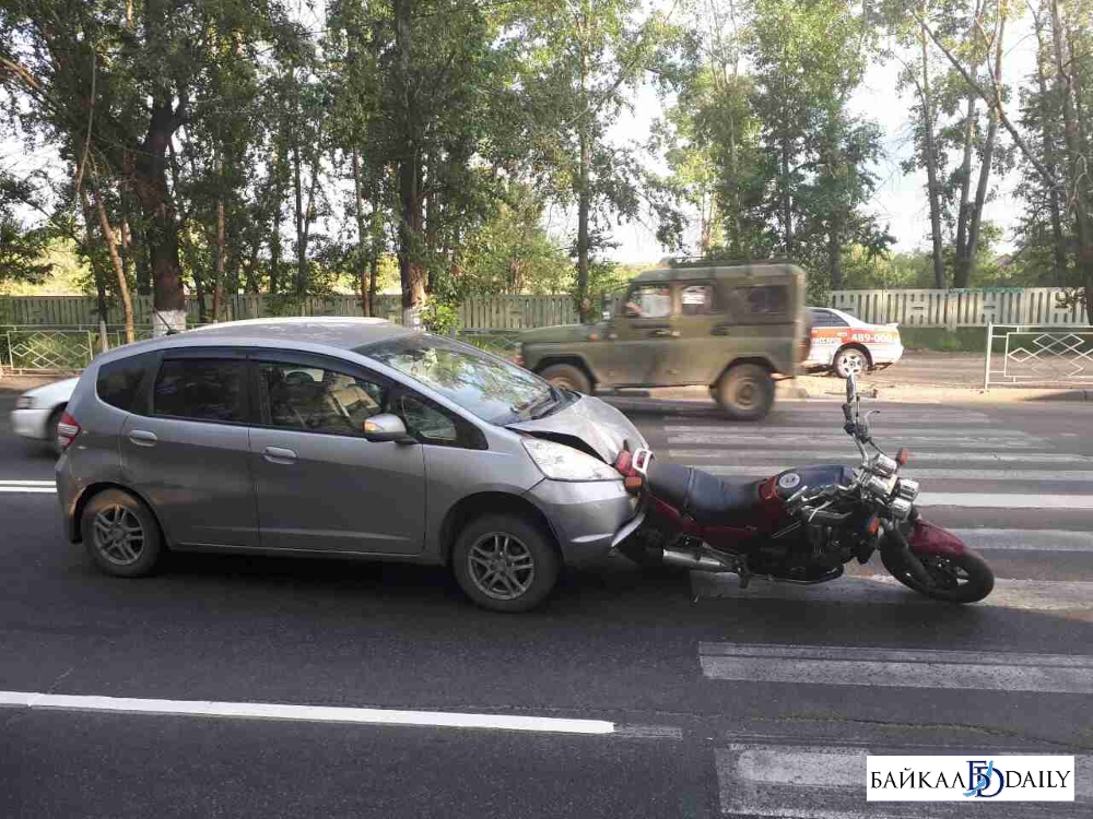 «Хонда Фит» перед пешеходным переходом врезалась в ехавший перед ней мотоцикл, по всей видимости затормозивший, чтобы пропустить пешеходов. По словам очевидцев, пострадавших нет.