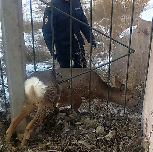 При осмотре территории полицейские нашли испуганное дикое животное. Вероятно, косуля, спасаясь от собак, попыталась проскочить сквозь забор, но окончательно застряла между прутьями. Подручными средствами вызволить косулю из неожиданного плена оказалось невозможным. Решено было вызвать специалистов из МЧС с гидравлическими ножницами для резки металла.