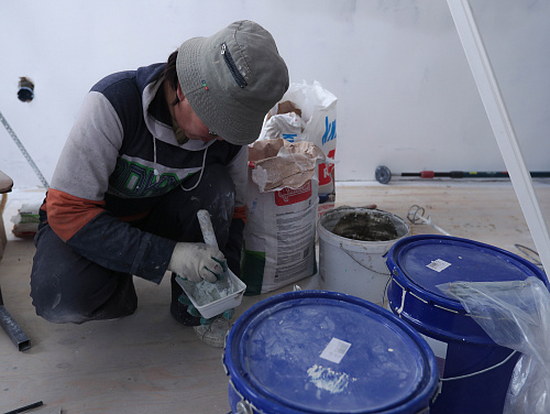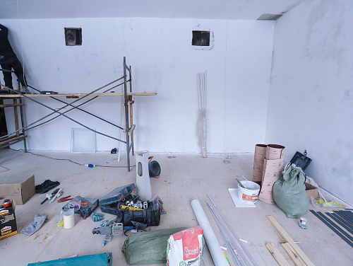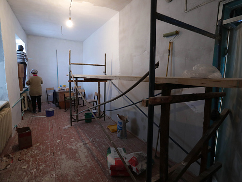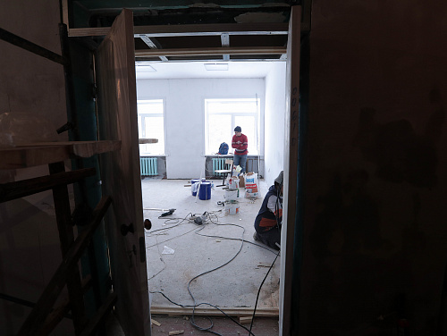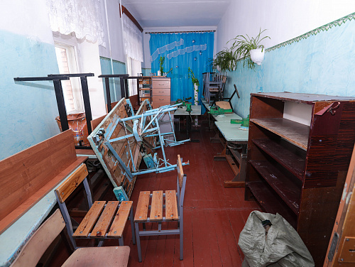 В ходе обхода комиссия приняла решение также отремонтировать второй класс, расположенный этажом ниже, который был залит водой во время тушения пожара. Здесь приведут в порядок стены и потолок. Сотрудники мэрии отметили, что в спортивном зале заметно прохладнее, чем в классах. Большие окна закрыты прозрачной пленкой, батареи теплые, но не горячие. Высокие потолки давно не крашены.