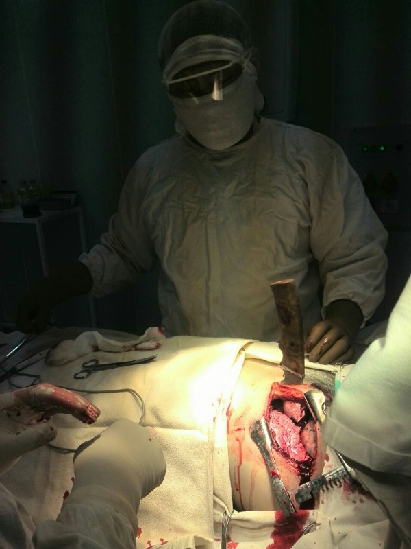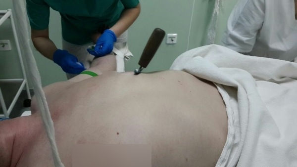 Врач, не вынимая ножа, сделал торакоцентез, дренировал плевральную полость. Затем под контролем вынул нож. Очистил глубокую рану от скопившихся сгустков крови. Тут внезапно выявилось обширное повреждение перикарда. Врач произвёл осмотр сердца на предмет ранения. Но сердце не было задето. Тогда хирург ушил сердечную сумку, повреждённые соседние органы. Остановил кровотечение из множества разрезанных острием ножа сосудов.