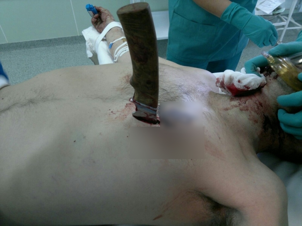 У пациента, молодого парня огромный охотничий нож с остро заточенным лезвием торчал прямо над областью сердца. Оказывается, парень пострадал в драке, где не обошлось без «возлияний».