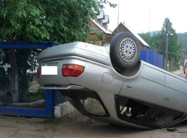 Ка видно на фото, автомобиль стоит на крыше, в нём выбиты стёкла, сломаны зеркала заднего вида.