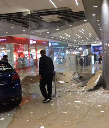 На видео, опубликованном в социальных сетях местными жителями, видно, как охрана устанавливает ограждение вокруг обрушившейся конструкции, а мимо проходят посетители центра. При этом из образовавшейся в потолке дыры льётся вода.