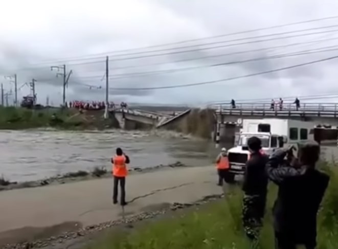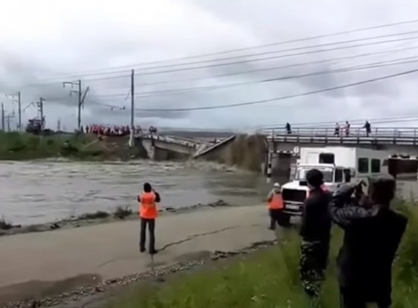 В Забайкальском крае, которое с 8 июля страдает от наводнения, сняли на видео обрушение железнодорожного моста. Мост рухнул в реку Кия в Шилкинском районе. Очевидец запечатлел на видео момент обрушения.