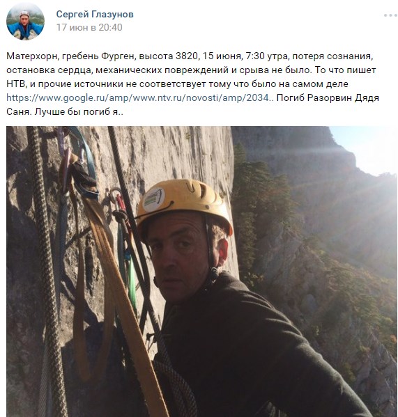 Сам Сергей Глазунов в прошлом месяце оставил на своей странице эмоциональный пост по поводу гибели ещё одного иркутского альпиниста, Александра Разорвина, в Альпах. Он погиб при восхождении на вершину Маттерхорна 15 июня. Сергей опроверг информацию, что его друг сорвался и получил смертельные травмы от падения. «Потеря сознания, остановка сердца, механических повреждений и срыва не было», - написал он.