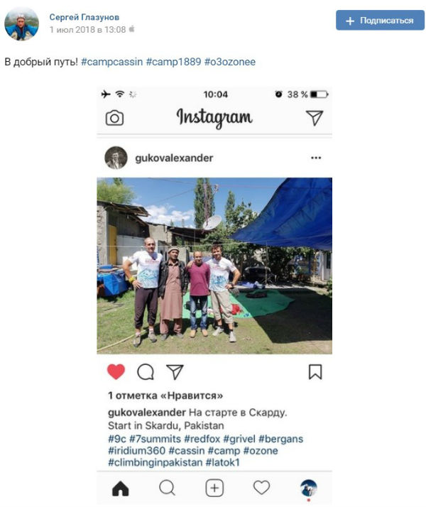 «Неожиданно, но в этом году в ВС под Латком 1 будет многолюдно. Настала и наша очередь присоединиться. Будем стараться пройти северное ребро, которое мы пытались сходить в прошлом году. Первоначальный состав немного изменился, Александр Гуков и Сергей Глазунов. Во время восхождения будем использовать трекер Иридиум360 Рокстар21316. Следить за нами можно по ссылке. Надеюсь сбоев не будет. Также планируем снять фильм о нашем восхождении. Спасибо всем, кто откликнулся и поддержал наш краудфандинг проект и вообще нашу экспедицию».