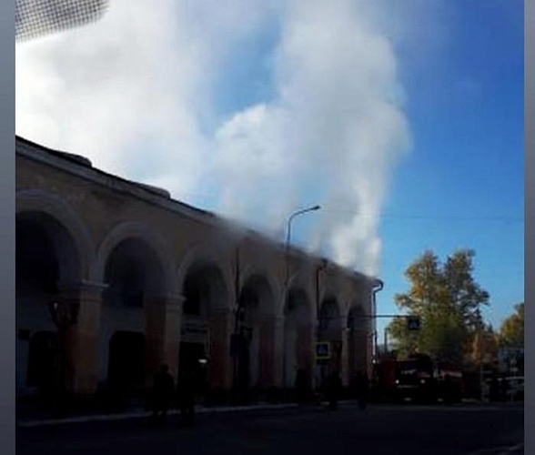 Сообщение о загорании двухэтажного кирпичного здания «Торговые ряды» поступило сегодня утром на телефон пожарно-спасательной службы от очевидцев.
