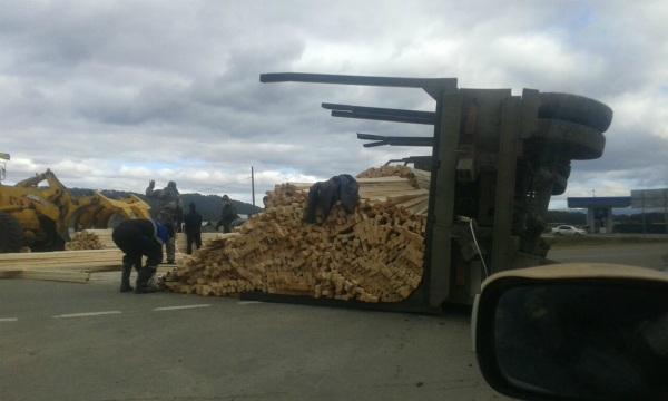 8 октября недалеко от посёлка Турунтаево Прибайкальского района Бурятии опрокинулся большегруз, гружённый пиломатериалами.