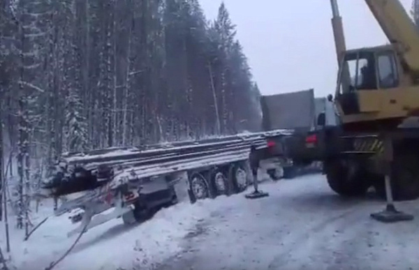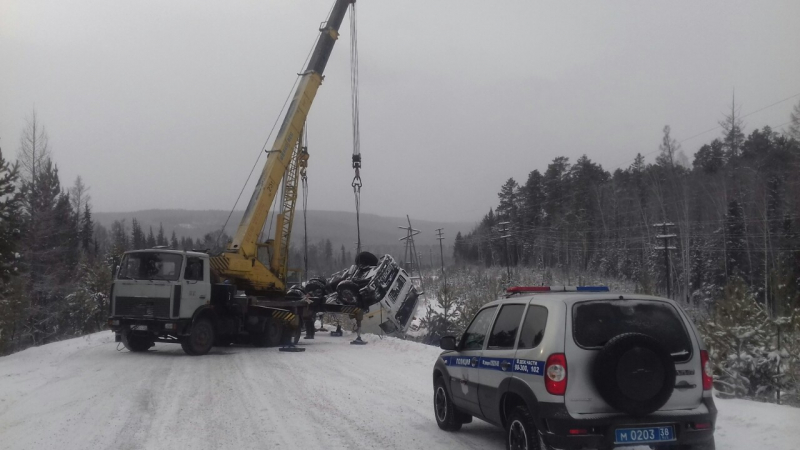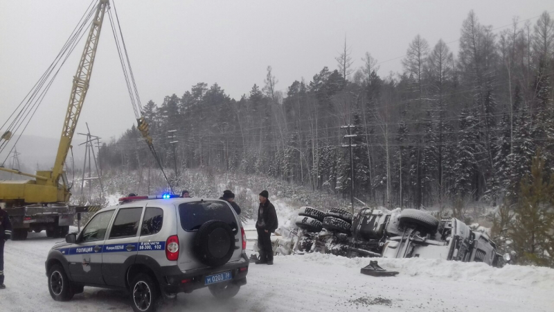При дальнейших попытках выехать на дорогу, грузовик завалило на бок. Вернуть тяжёлый автомобиль на дорогу получилось с помощью крана, сообщает пресс-служба ГУ МВД России по Иркутской области.
