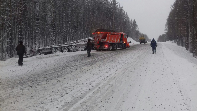 Через 100 километров полицейские обнаружили второй съехавший с дороги грузовой автомобиль. Водитель большегруза при подъёме не справился с управлением и его стянуло в кювет.