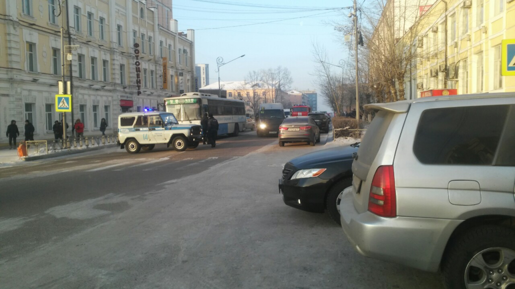 Сегодня утром центр Улан-Удэ оказался перекрыт. По словам очевидцев, все оперативные службы, в том числе пожарные машины приехали на площадь Советов. Машины, проезжавшие через центр города, разворачивали, водителей же автомобилей, которые припарковались здесь, просили выйти из машины и отойти подальше.