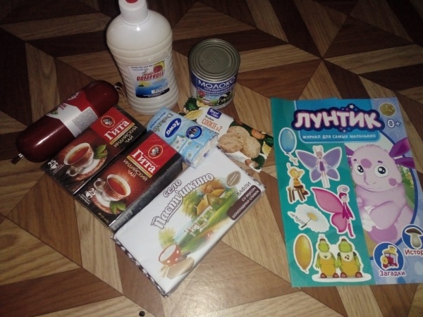 Судя по фотоочётам, в заветных подарочных пакетах были вафли, две пачки чая, палка колбасы и средство для мытья посуды. Некоторым также достались одноразовые носовые платочки и детский журнал.