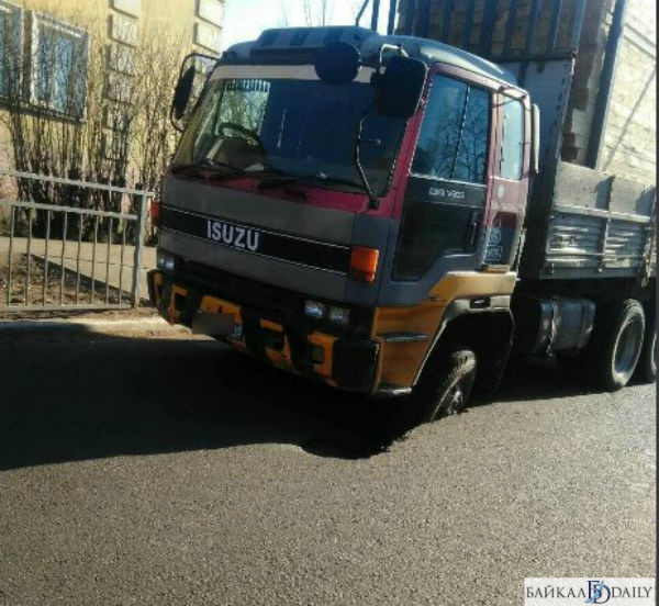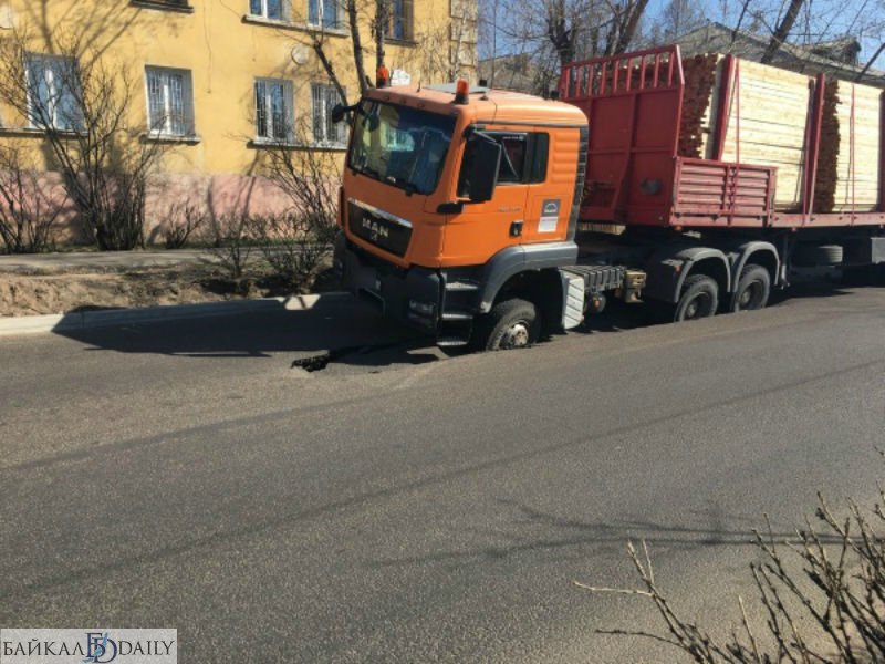 Сегодня утром, 30 апреля, два грузовика провалились под асфальт. ЧП произошло на улице Балдынова в посёлке Восточный. Под асфальтом оказались колёса транспортных средств. Два большегруза были нагружены брусом.