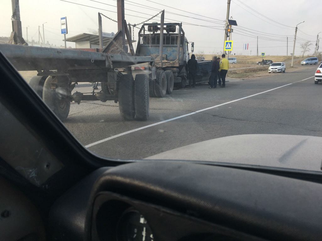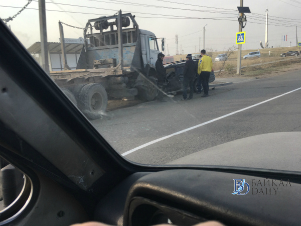 Крупное ДТП произошло сегодня в Улан-Удэ. На улице Комарова столкнулись КамАЗ и Toyota Caldina. По словам очевидцев, грузовая машина выехала на встречную полосу, где и совершила столкновение с «легковушкой». Переднюю часть «Тойоты» буквально смяло от удара.