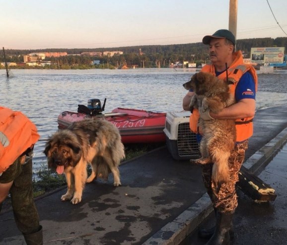В городе Тулун Иркутской области спасатели МЧС и кинологи питомника «К-9» Иркутска снимают домашних животных с крыш и возвышенностей и выводят на берег.