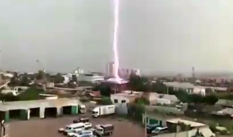 На кадрах видно, как мощный заряд молнии бьёт в крышу здания, после чего следует сильный грохот. Здание после небесного разряда не загорелось, судя по всему удар пришёлся по громоотводу.