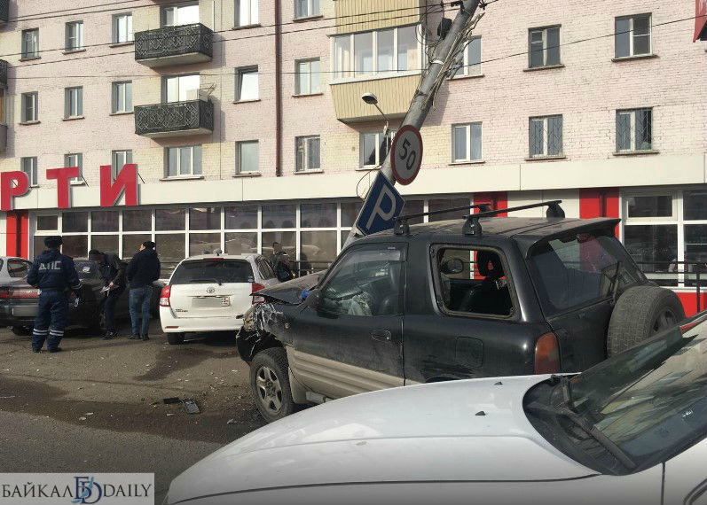 Сегодня днём на Саянах, возле магазина «Либерти» в Улан-Удэ произошло ДТП. Водитель кроссовера врезался в электроопору. В результате столб покосился и едва не рухнул.