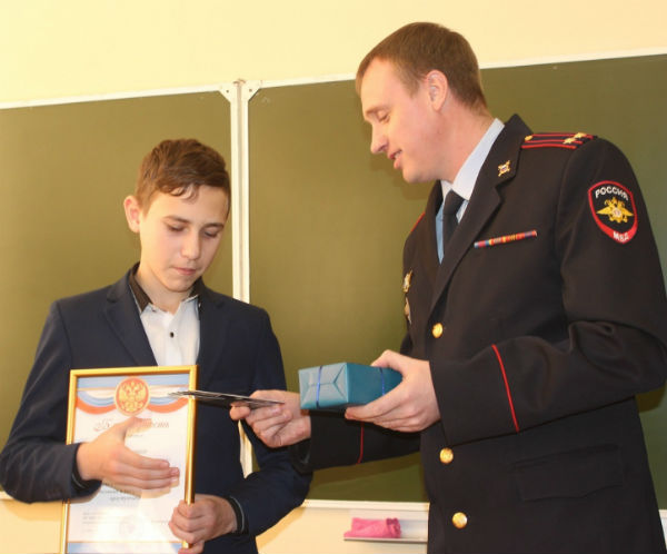 В торжественной обстановке полицейские под аплодисменты учителей, одноклассников и родителей вручили Вячеславу ценный подарок и благодарность. Кроме этого, от имени общественного совета при ГУ МВД Вячеслав Дорошенко получил интеллектуальную настольную игру «Я полицейский», а от сотрудников ОВД – приглашение на службу в полицию по окончанию обучения.