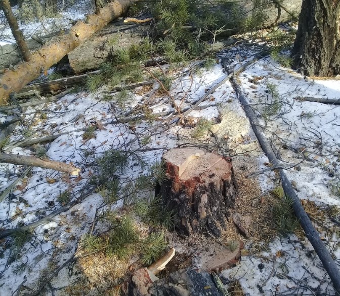 Вскоре лесники обнаружили мужчину, который заготавливал древесину. На просьбу представить правоустанавливающие документы, правонарушитель сознался, что спилил сосны незаконно.