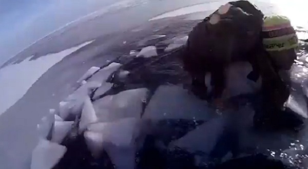На кадрах видно, как молодые люди идут по льду, заметно, что участок не весь покрыт льдом, местами виднеется вода. Но туристы продолжили движение. В этот момент они проваливаются в воду. Затем, цепляясь за хрупкий лёд, выбираются на сушу.