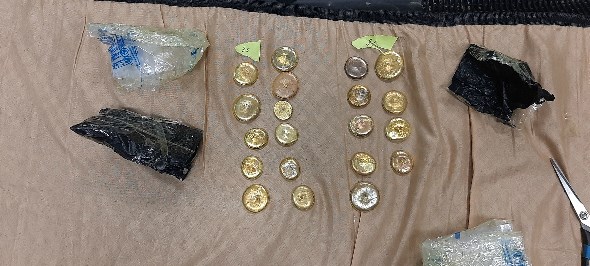 При тщательном осмотре автомобиля под пластиковой панелью салона таможенники нашли два полиэтиленовых пакета, обмотанных скотчем. В одном из свёртков находилось 9 слитков округлой формы из металла жёлтого цвета, в другом - 11 слитков. Общий вес слитков составил 1,272 кг.