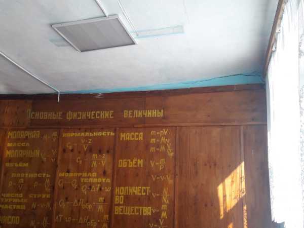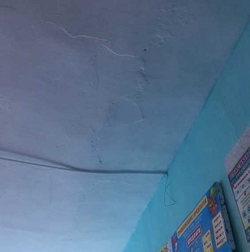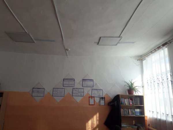 В полах, стенах и потолках имеются трещины и щели. В отдельных кабинетах потолки находятся в аварийном состоянии, местами провисают. В спортзале на стене от потолка до пола имеется большая вертикальная трещина.