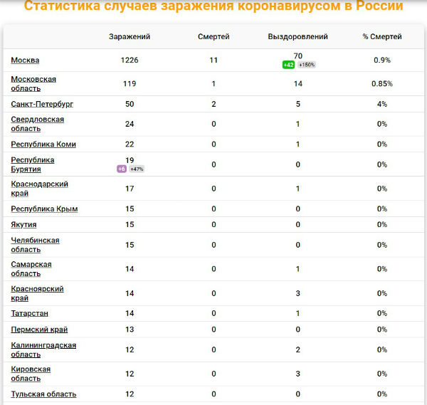 Лидером по распространению коронавируса остаётся Москва, там зарегистрировано 1226 случаев заражений. В пятёрку регионов, где больше всего случаев инфицирования, входят: Московская область ( 119 заражений), Санкт-Петербург ( 50 заражений), Свердловская область ( 24 заражений), Республика Коми ( 22 заражений).