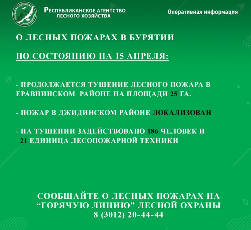 На утро 15 апреля продолжается работа по тушению лесного пожара в Еравнинском районе и дотушиванию локализованного очага в Джидинском районе на общей площади 43 га.