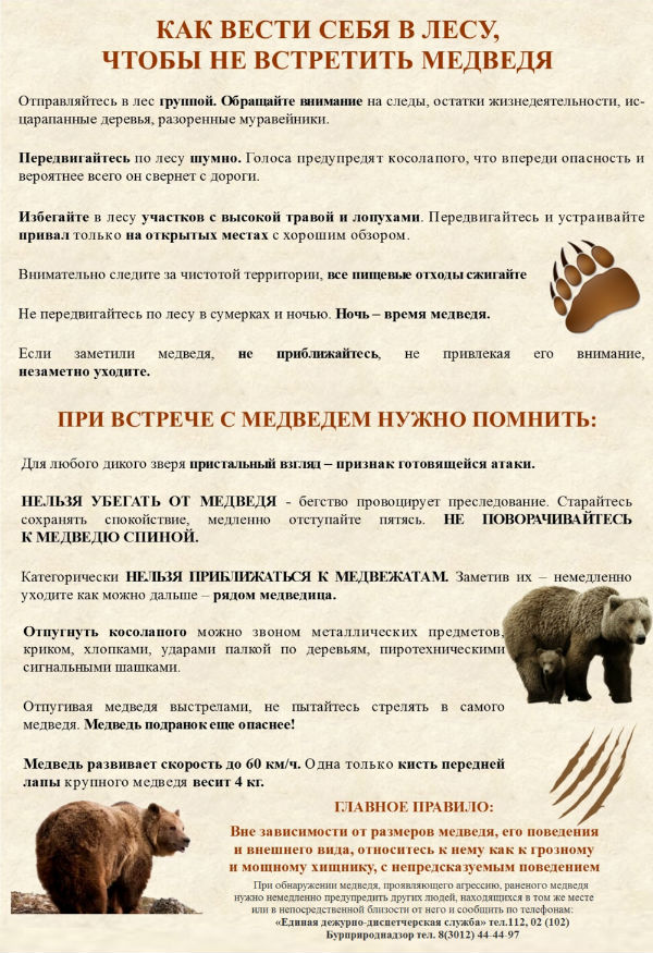 При обнаружении медведя, проявляющего агрессию, раненого медведя, нужно немедленно предупредить других людей, находящихся в том же месте или в непосредственной близости от него, и сообщить по телефонам: «Единая дежурно-диспетчерская служба» - 112, 02 (102), Бурприроднадзор – 8(3012) 44-44-97.