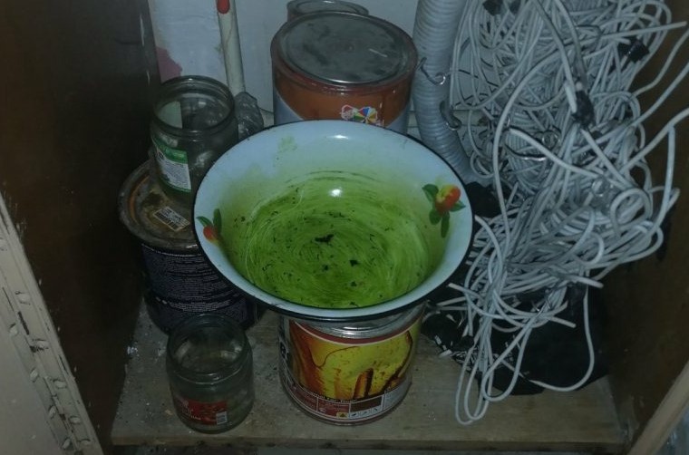 В одной из квартир на общей кухне были найдены металлическая чашка с зеленоватыми разводами, пакет с травой с резким запахом наркотика, папиросы и пустая бутылка из-под растворителя.