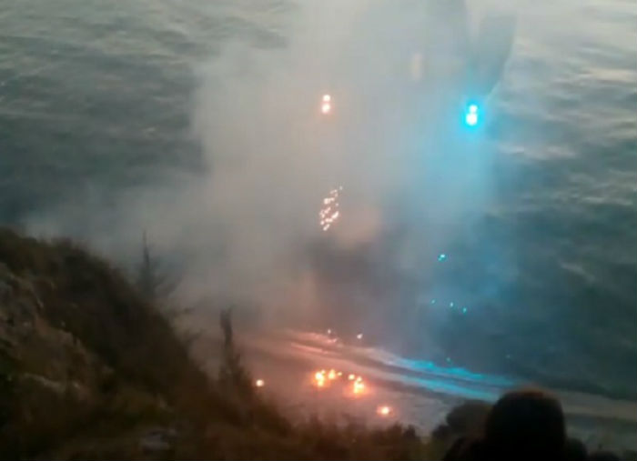 На полутораминутном видео запечатлены огни от пиротехники и громко играющая музыка, сам катамаран моргает разноцветными огнями.