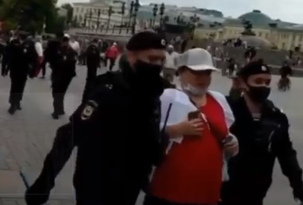 Очевидцы сняли видео задержания. Светлану повели к автозаку сразу шесть сотрудников полиции, один из них по пути вырвал плакат из рук женщины. За активистку вступились окружающие, в том числе дедушка с костылём.