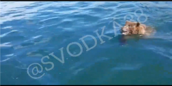 Резко медведь поменял направление и бросился в воду, рыча при этом.