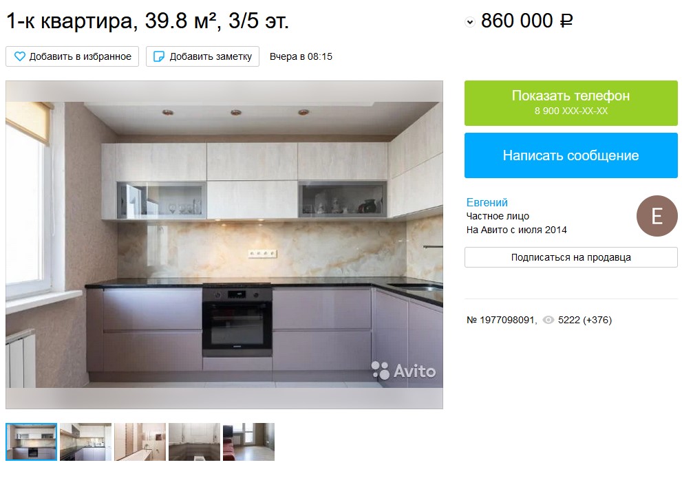 Покупатель сообщил ей, что нашёл на сайте Авито. ру отличный вариант на ул. Фрунзе. Продавец предлагает просторную квартиру в центре города, с современным ремонтом и новой мебелью по сказочной цене. «Однушка» почти в 40 квадратных метров выставлена всего за 860 тысяч рублей.