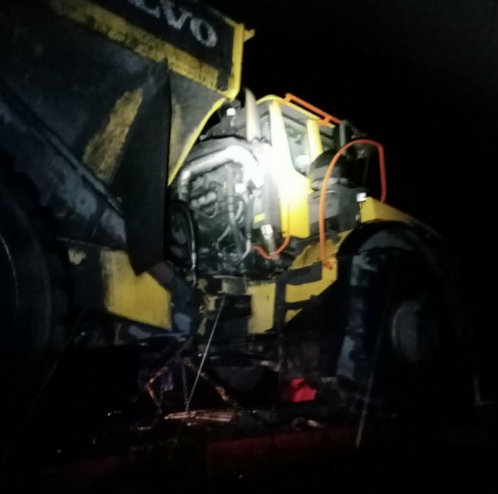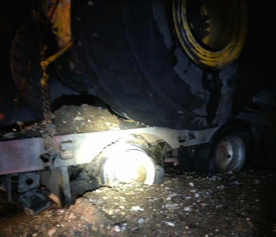 Вечером 27 августа на трассе вблизи села Мостовка Прибайкальского района Бурятии у тягача, перевозящего автопогрузчик, взорвалось и загорелось колесо.