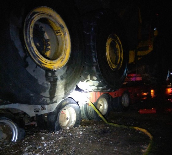 Гружённый техникой тягач загорелся на трассе
