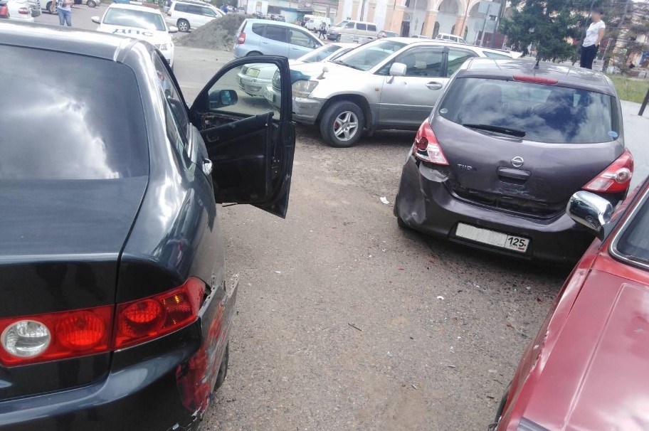 На парковке администрации города Кяхта водитель при движении задним ходом сбила двух девушек и врезалась в четыре припаркованных автомобиля – «Тойоту Королла», ВАЗ-21053, «Ниссан Тиида» и «Тойоту Хариер».