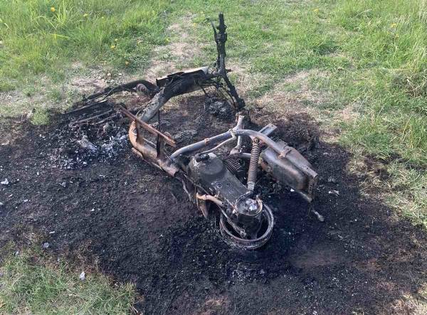 После ДТП в порыве гнева отец юного водителя поджёг мопед. Транспортное средство полностью уничтожено огнём.