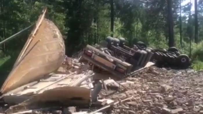 Большегруз «Вольво» съехал с проезжей части и опрокинулся.