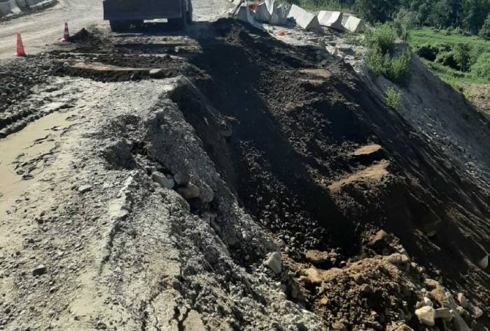 В настоящее время дорожники устраивают временное дорожное покрытие из щебеночно-песчаной смеси. На объекте установлены временные дорожные знаки, заблаговременно предупреждающие водителей об участке производства работ. Земляное полотно восстановят к 12 июля.