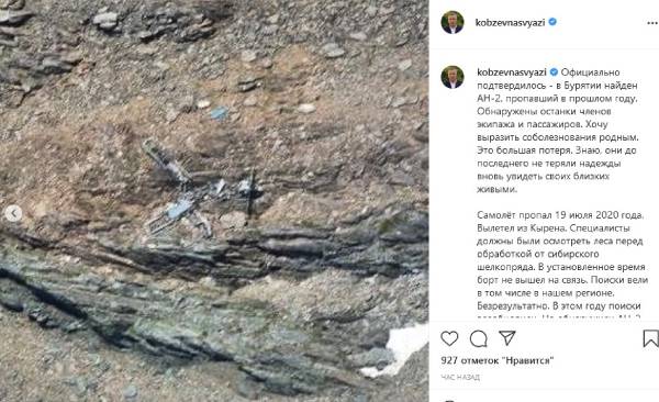 - Официально подтвердилось - в Бурятии найден АН-2, пропавший в прошлом году. Обнаружены останки членов экипажа и пассажиров. Хочу выразить соболезнования родным. Это большая потеря. Знаю, они до последнего не теряли надежды вновь увидеть своих близких живыми, - написал Игорь Кобзев.