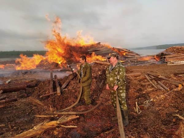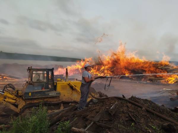 Первой к месту пожара прибыла местная добровольная пожарная команда. Было принято решение тяжёлой техникой столкнуть брёвна в воду, но бульдозеры не смогли подойти к ним из-за высокой температуры.