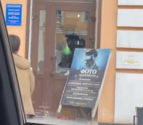 В этот момент внутрь проходят посетители, дверь им придерживает сотрудник общепита. Затем дебошир берёт стенд и бросает его в стекло двери, от чего оно разбивается.