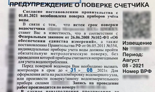 В Улан-Удэ рассылают уведомления, требующие проведения срочной поверки или замены приборов учёта воды. Однако такая фирма как «Центр метрологии ЖКХ» не обращалась с заявлением на согласование работ по установке, замене или проведения поверки индивидуальных приборов учёта в МУП «Водоканал». В связи с этим, МУП «Водоканал» предостерегает всех потребителей о возможном мошенничестве, сообщает управление по информационной политике города.
