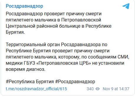 - По факту смерти пятилетнего ребенка в ГБУЗ «Петропавловская ЦРБ» от острой хирургической патологии минздрав РБ сообщает: в настоящее время завершается судебно-медицинская экспертиза для установления причины смерти ребёнка. После получения результатов будет осуществлена полная проверка ведения данного пациента комплексной комиссией минздрава Бурятии с привлечением экспертов ФГАОУ ВО РНИМУ им. Н. И. Пирогова Минздрава России в рамках ведомственного контроля, - отметили в пресс-службе.