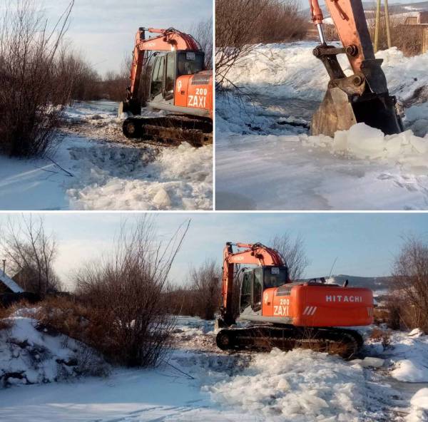 На место выезжала рабочая группа от администрации Заиграевского района. Сейчас организованы работы по отводу наледи. С использованием спецтехники проведено углубление русла ручья протяженностью 700 м, на глубину 70 см.