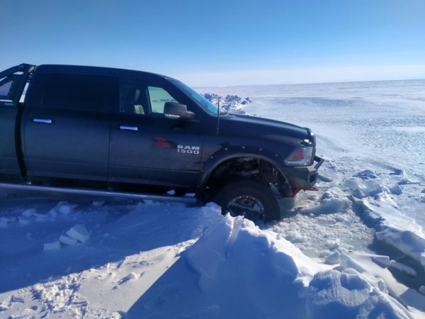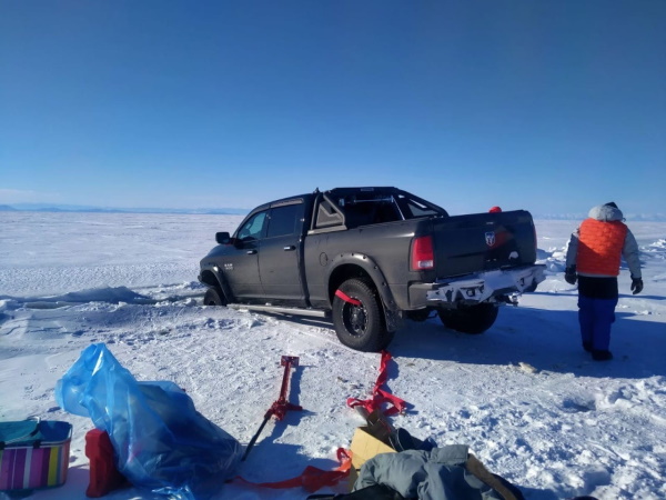 Автомобиль Ford Ranger ехал от мыса Хобой в посёлок Турка Прибайкальского района Бурятии. В пути пикап попал в трещину передними колёсами и застрял.