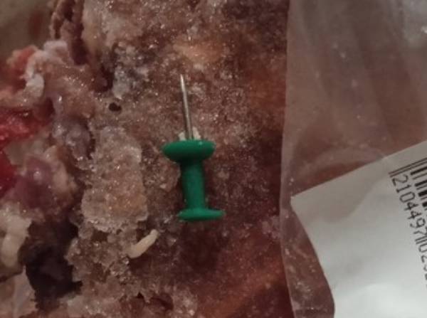 - В Иволгинске купила в магазине мясокостный корм для собак, а там не очень приятный сюрприз. Я, конечно, все понимаю, но иголки-то зачем туда бросать? В прошлые разы и пакеты и бумага встречались, но, блин, кнопка с иглой! Так что будьте осторожны! Работникам мясного цеха тоже внимательнее, пожалуйста, - обратилась женщина.