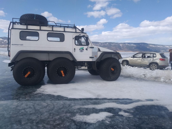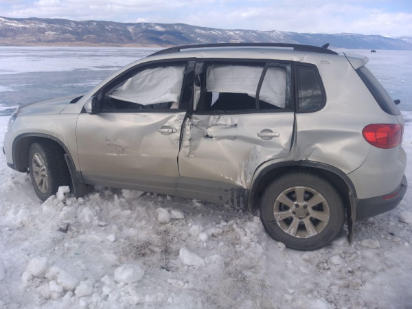 Днём 26 марта на льду Байкала, а точнее на ольхонской ледовой переправе, произошло ДТП. Там столкнулись самоходная машина «Трэкол» и Volkswagen Tiguan.